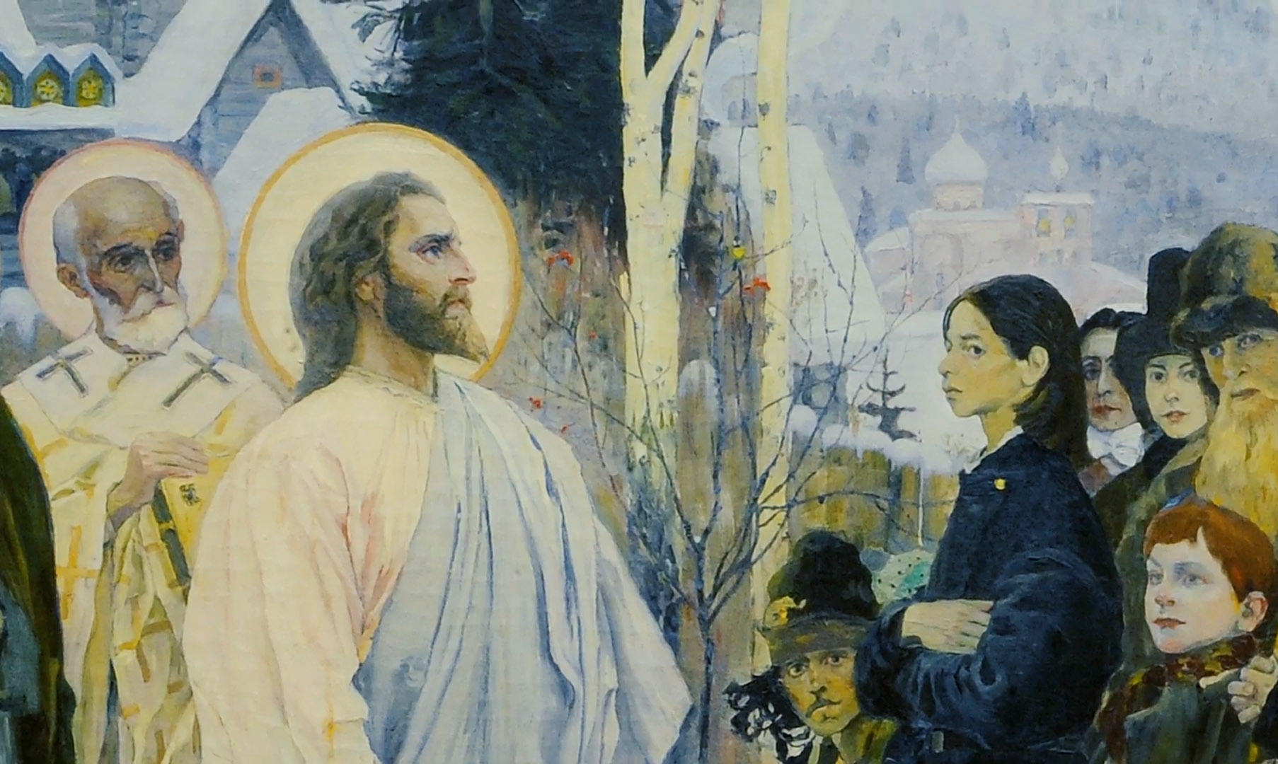 Автор лекции, Ольга Кленова, ведущий художник-реставратор Русского музея, рассказывает о работе по восстановлению известнейшего произведения из музейного собрания — картины Михаила Нестерова «Святая Русь» (1905).