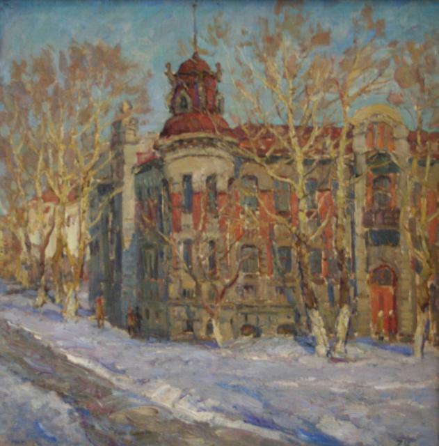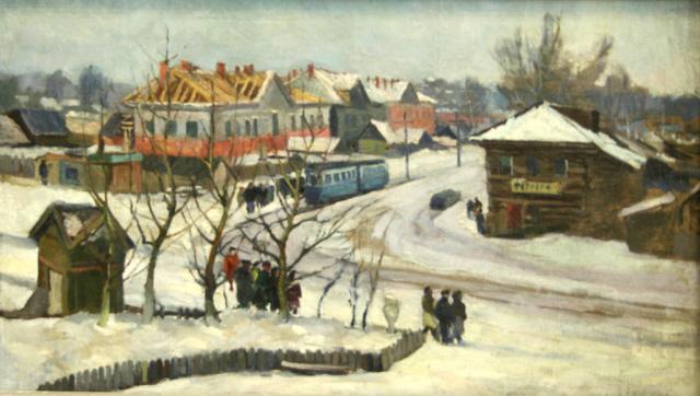 Харин И.Е. Краевой театр. Зима. 1942. Картон, масло. 24,2х33,5. Государственный художественный музей Алтайского края