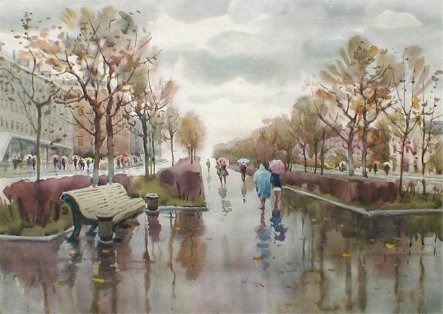 Югаткин А.А. Ленинский проспект после дождя. 1978. Бумага, акварель. 54 х 74. Государственный художественный музей Алтайского края