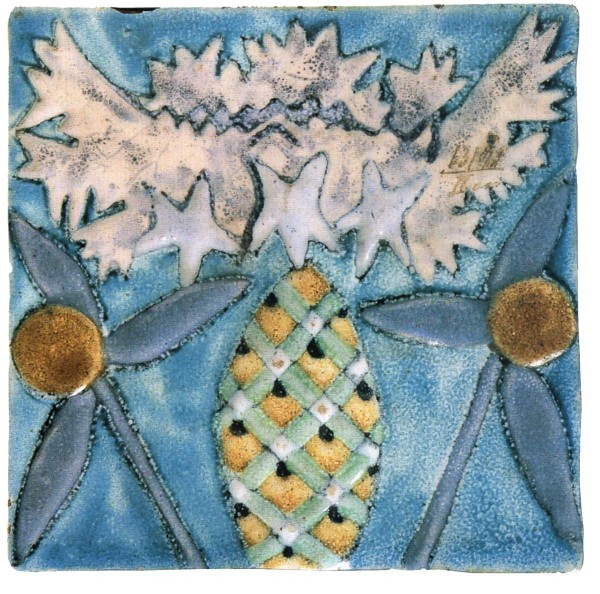- Глина, формовка, рельеф, роспись цветными глазурями (семи цветов), роспись по эмали (белой). 18 х 18
