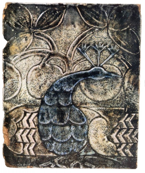 - Глина, формовка, рельеф, роспись цветными глазурями (трех цветов), роспись по эмали (белой). 41 х 33,5