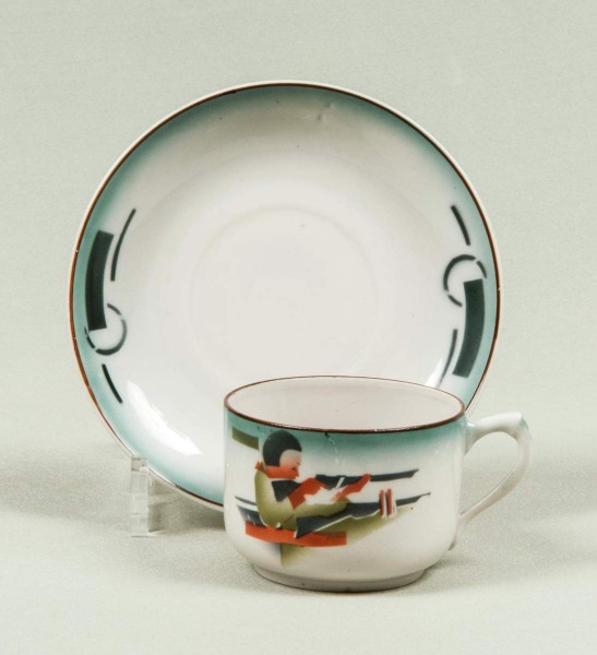 - Фарфор, роспись надглазурная (аэрограф по трафарету). 5,9 х 10,6 х 8,2 (чашка), дм — 15,9 (блюдце)