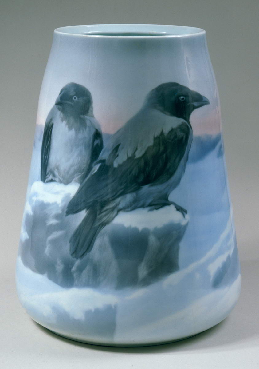 Пейзажная живопись на ИФЗ начала XX века исполнялась в традиционной реалистической манере. На этой вазе на снегу крупно изображены вороны.