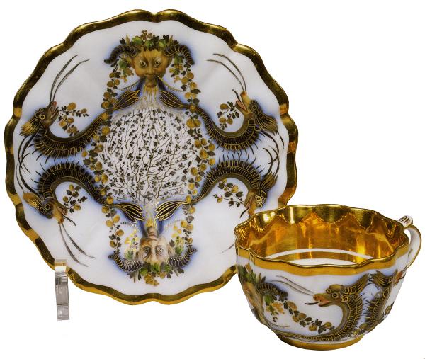 - Фарфор, роспись надглазурная, серебрение, золочение. Чашка – 5,4 х 10,5 х 8,7; дм. блюдца – 5,5.