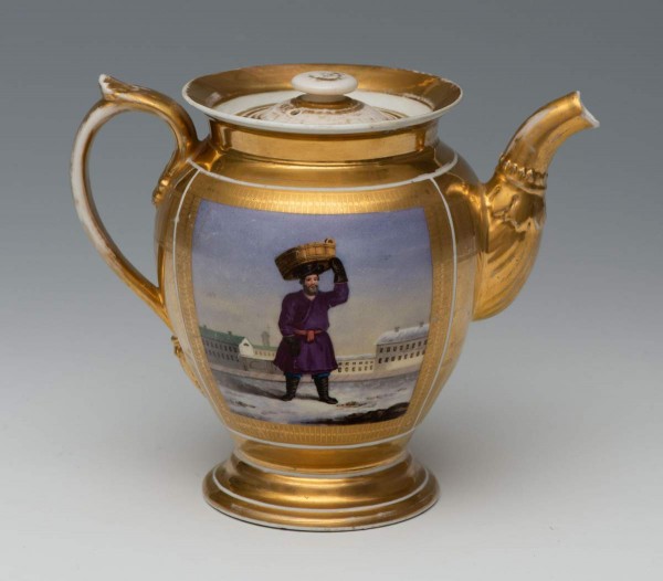 Чайники обычно входили в состав сервизов. Однако известно, что в большом количестве они выпускались и отдельными „штуками": заварные и доливные (для кипятка), скромные и более нарядные. разных размеров и „фасонов". А некоторые из них, несомненно, делались для украшения горок — небольших застекленных шкафчиков. Воссоздавая на фарфоровых предметах ту или иную композицию мастера по фарфору использовали гравюру, рисунок или книжную иллюстрацию. В данном случае композиция исполнена по литографии К. И. Кольмана "Продавец рыбы". С другой стороны изображена целующаяся парочка.