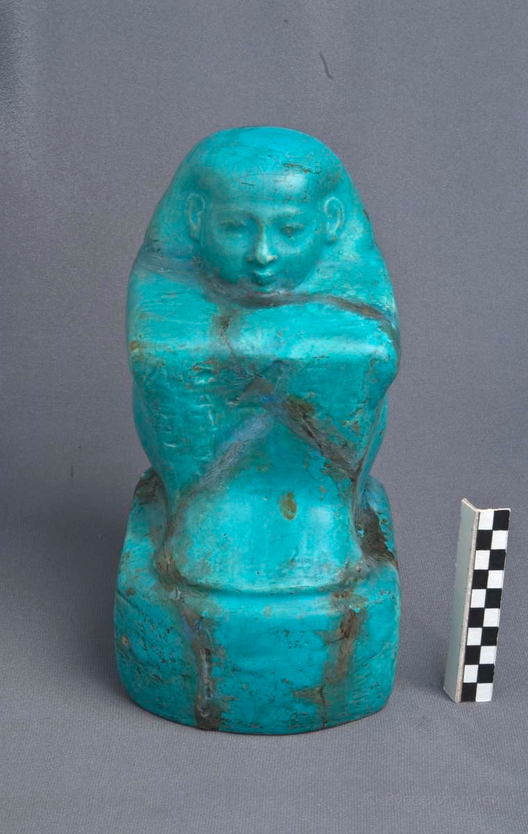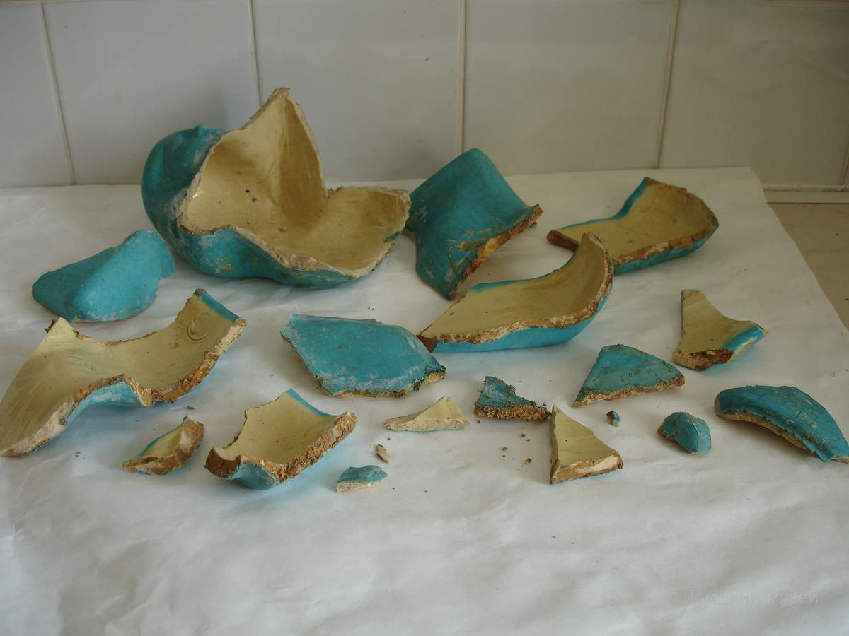В процессе реставрации экспонат «расшит» на 18 фрагментов. Фрагменты очищены от стойких загрязнений и пластилина. Со швов и поверхности фрагментов удален старый клей и его следы. Экспонат склеен, швы мастикованы. Утраты и сколы восполнены и тонированы.