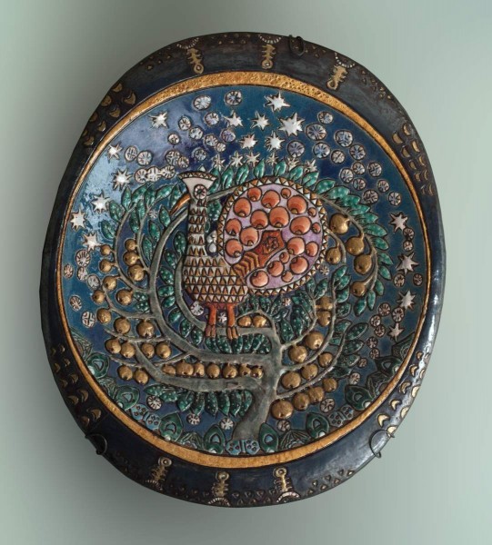 - Майолика, формовка, роспись цветными глазурями, восстановительный обжиг. В. 9,0; Дл. 60,0; Ш. 51,0