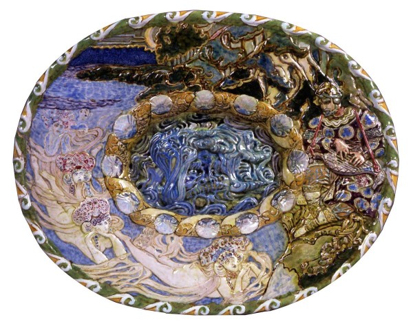 Блюдо входит в серию майолик М.А.Врубеля на тему былины "Садко". В собрании ГРМ имеются еще два экземпляра, отличающиеся друг от друга размерами и цветовой гаммой. Акварельный эскиз к блюду (собрание ГРМ) был представлен на выставке "Мир искусства" 1903 года.