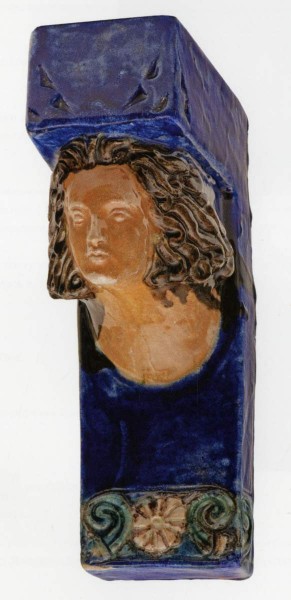 - Глина, формовка, роспись цветными глазурями, роспись по эмали (белой). 36,5 x 10,5 x 18,5
