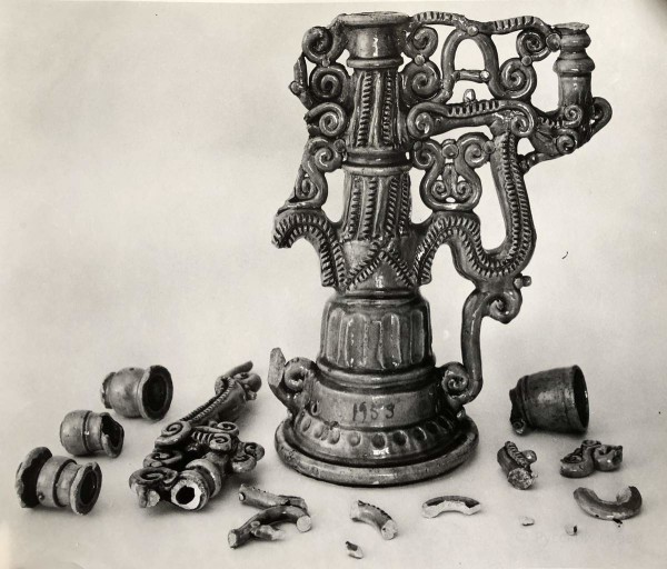 Подсвечник был разбит на 12 частей с многочисленными мелкими крошками. Утрачены основания двух профиток. Отсутствовали две симметричные детали между центральной и боковыми профитками, над буквой «А». По всей поверхности многочисленные сколы и трещины глазури, особенно на выступающих деталях. Один завиток слева, под боковой профиткой утрачен. Сильное поверхностное загрязнение.