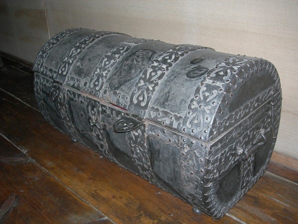Деревянный сундук цилиндрической формы ‒ работа русских умельцев конца XVII века. Сундук обит кожей и окован широкими железными полосами с ажурным рисунком. Фигурные железные ручки украшают боковые стенки. Сундук имеет необычную форму бочонка, которая дает возможность перекатывать груженый сундук с места на место даже одному человеку.