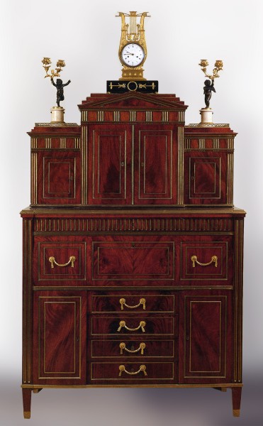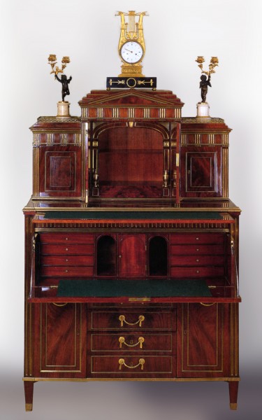 Бюро красного дерева выполнено в мастерской известного мебельного мастера Генриха Гамбса. Верх бюро оформлен в виде греческого храма, с высокой средней частью, с фронтоном и низкими боковыми, с бронзовыми ажурными навершиями из завитков.