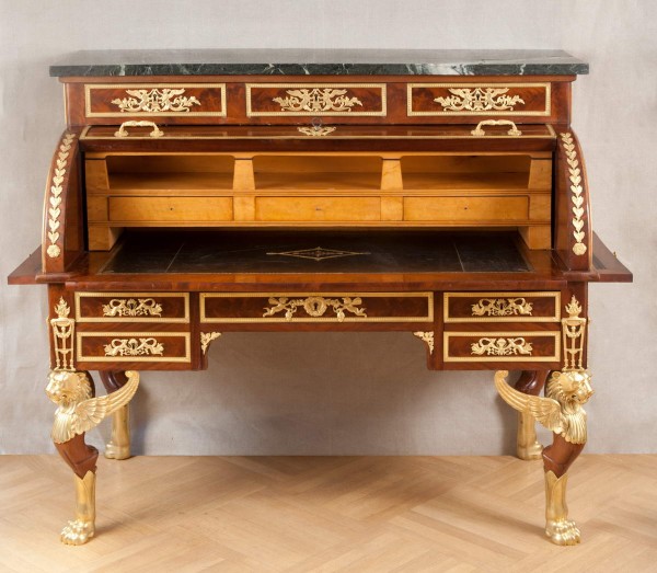 - Красное дерево, клен «птичий глаз», фанеровка, bronze, casting, gilding, кожа, тиснение золотом, marble. 127 × 145 × 71