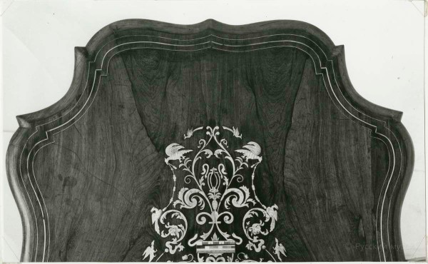 Все лицевые поверхности были заполированы шеллачной отбеленной политурой по известной методике. Имитация гравировки на новых элементах инкрустации производилась по аналогии с подлинной гравировкой на соседних деталях при помощи пера и туши (по лаковой плёнке). Штрихи туши закреплялись ещё одним слоем политуры.