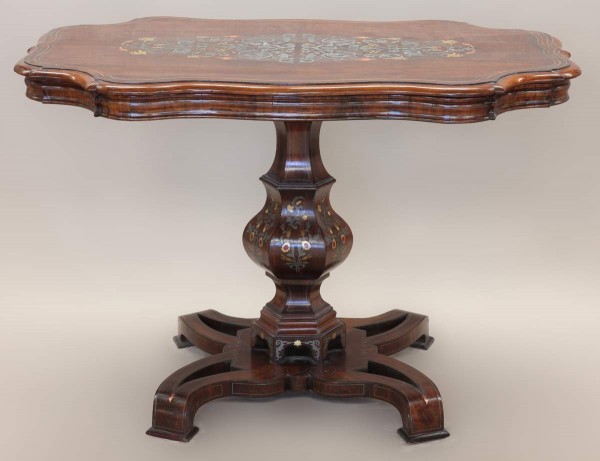 На столешнице и на ножках имелись многочисленные отслоения и утраты инкрустации (цинк, латунь и медь), некоторые фрагменты хранились отдельно. Гравировка на металле во многих местах сохранилась. На столешнице по краю , вдоль кромок из массива палисандра, образовались трещины. Поверхность палисандровой древесины сильно выцвела, в результате чего первоначальный тёмно-коричневый с фиолетовым отливом цвет изменился до светло-коричневого. Лаковое покрытие тонкое, загрязнённое, сильно потёртое, с многочисленными царапинами и пятнами.