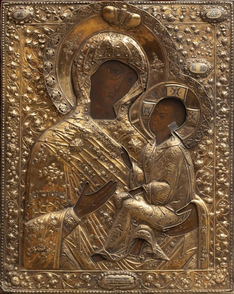 Образ «Богоматери Тихвинской» (память 26 июня / 9 июля) имеет древнюю историю. «Богоматерь Тихвинская» — один из вариантов «Богоматери Одигитрии». Иконография образа сложилась в византийском искусстве. Отличительной чертой этого типа является своеобразное положение скрещенных ножек Спасителя, при котором одна, правая, подвернута так, что видна ее обнаженная подошва. Первоначально икона находилась в Иерусалиме, в V в. царица Евдокия перенесла ее в Константинополь и поставила в специально выстроенном для нее храме — Влахернском. На Русь икона попала чудесным образом в 1383 г. (за 70 лет до падения Царьграда). Оставив византийскую столицу за «гордость и неправды», она «перенеслась» в Тихвин, впервые явившись рыбакам на Ладожском озере. Явление иконы сопровождалось многими чудесами и исцелениями. Ранние «Сказания об иконе "Тихвинской Богоматери"» принадлежат к первой половине XVI в. и отличаются краткостью изложения. Расширенные списки относятся уже к XVII в. и включают сообщения о шведском нашествии на обитель в 1611–1613 гг. Мария Федосеева // «Пречистому образу Твоему поклоняемся...». Образ Богоматери в произведениях из собрания Русского музея. СПб. 1995. С. 207.