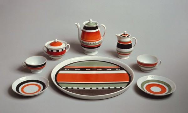 В одном из наиболее известных своих произведений – сервизе «Тракторный» 1932 года, сохраняя орнаментальный характер росписи, Суетин довел ее до уровня образного истолкования. Чередующиеся в горизонтальном направлении красно-оранжевые, черные и зеленые полосы несут в себе заряд энергии. Монументальная абстрагированность росписи позволяет соотнести ее с полотном Казимира Малевича «Красная конница». Белые силуэты крохотных тракторов, обозреваемые как бы с космической высоты, цепочкой движутся друг за другом, внося в роспись элемент предметной конкретности. Согласно схеме-расстановке, начертанной на обороте подноса, части сервиза должны занять в этой композиции отведенные им места (подобный прием, как говорилось ранее, Суетиным был выработан еще в начале 20-х годов). В росписи каждого предмета сохранена цветовая индивидуальность. Декор сервиза «Тракторный» занимает почти всю поверхность предметов. Оставленные не записанными полосы белого фарфора включаются в канву орнаментального ряда. Суетина попрежнему занимает проблема движения орнаментальных композиций. По сравнению с ранними росписями движение, охватывающее орнамент, здесь однородно, развивается вокруг предметной формы. Во власти кругового движения оказался и план расстановки сервиза: все его составляющие экспонируются по кругу, центр которого образует большое блюдо-поднос.