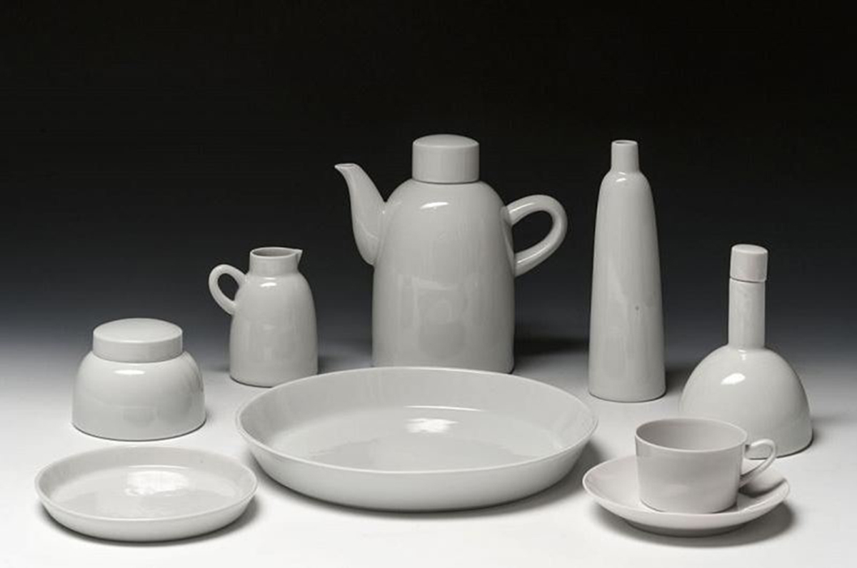 Состоит из 13 предметов: кофейника с крышкой, сливочника, сахарницы с крышкой, ликерника с крышкой, вазы для цветов, подноса, трех тарелочек, двух чашек и двух блюдец.