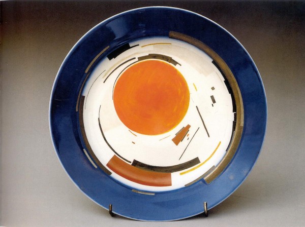 В блюде значительно сильнее выражена многоплановость композиции. Достигается это контрастным сопоставлением крупных цветовых плоскостей — темно-синий борт, красно-оранжевая планета, белый фарфор. Резче контрастируют и масштабы отдельных элементов — диск, вращающиеся дуги и еле видимые в „бесконечном белом“ геометрические фигуры. Главный сюжетный и пластический элемент росписи — огненная планета — исполнен в свободной живописной манере, как на холсте, когда заметно движение кисти, каждый ее мазок. Отсюда ощущение не просто красной, но пылающей поверхности.