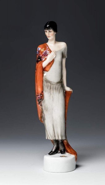 Утонченный силуэт фарфорового портрета-статуэтки очень выразителен: одной рукой Ахматова держит ниспадающую до пят шаль, другой придерживает ее на груди. На правое плечо накинута красная шаль с орнаментом из золотого дракона и пестрых цветов.