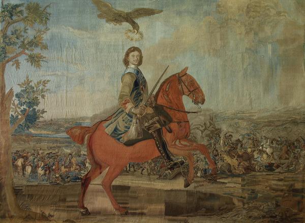 В центре шпалеры – конный портрет Петра I – монументальный убедительный образ полководца. Фигура императора на вздыбленном гнедом коне эффектно изображена на фоне сражения. Автору и исполнителям шпалеры удалось найти необходимую степень обобщения и достичь монументальности, необходимой для работ подобного рода, создав скупыми средствами ковроткачества выразительный художественный образ.