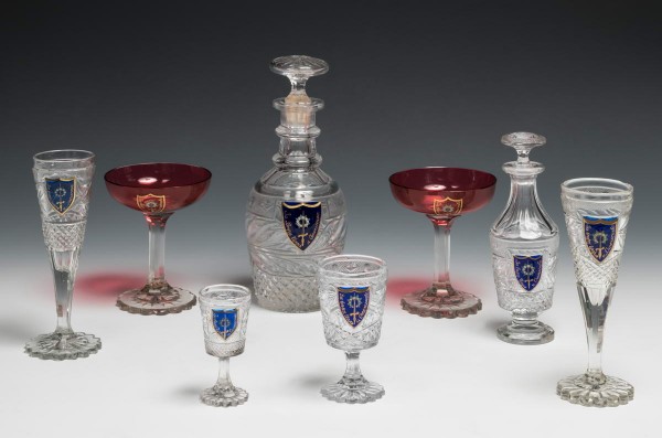 - Хрусталь бесцветный и цветной (кобальтовый, «золотой рубин»), алмазная грань, роспись