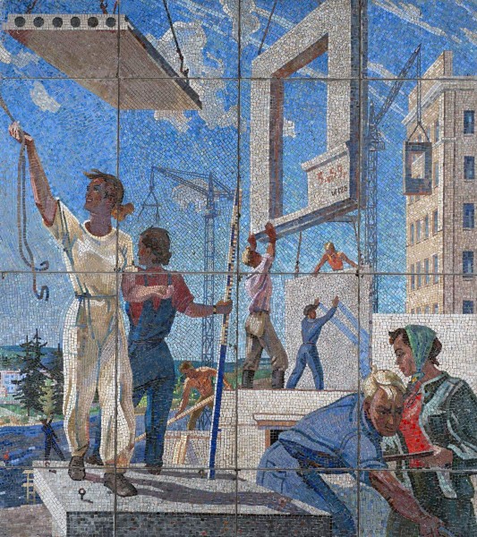 Home page Online resourcesCollectionsDecorative and Applied Art Панно «Мирные стройки» Deineka A. A. 1899, Kursk - 1969, Moscow Панно «Мирные стройки» 1959–1960 Mosaic, стекло, marble. 375 х 340 СТ-3007 Пост. в 1961 из Дирекции Художественных Фондов и Проектирования Памятников /ДХФПП/ Москва Period Late 20th century – 21st century Typology / subtypeMosaic CategoryGenre Painting Keywords 1945–1991 | Soviet Art | Workers | headdress | female costume | labor, work Virtual exhibitions and 3d-tours The 100th Anniversary of the USSRАлександр Дейнека. Певец новой жизни. К 125-летию художника Share «Виртуальный Русский музей» в социальных сетях: