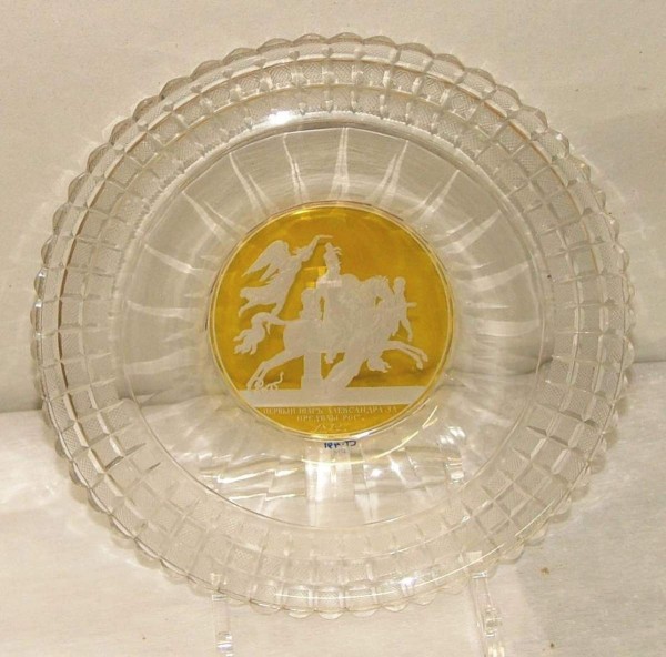 В 1838 году к 25-летию победы над Наполеоном и 10-летию заключения Адрианопольского мирного договора на Императорском стеклянном заводе по эскизам Ф. П. Толстого была исполнена серия тарелок с гравированными изображениями на темы Отечественной войны 1812 года, Заграничных походов 1813–1814 годов и русско-турецкой войны 1828–1829. Серия, посвященная Отечественной войне и Заграничным походам, состояла из девятнадцати тарелок (по количеству медалей, созданных Толстым в 1814–1830), а серия, связанная с русско-турецкой войной, — из шести тарелок. Все тарелки были созданы с применением новой в то время техники серебряной протравы, благодаря которой аллегорические гравированные изображения ясно видны на желтом фоне нацвета. Тарелки были преподнесены императору Николаю I к празднику Святого Рождества в декабре 1838 года и хранились по его распоряжению в сервизной кладовой Собственного (Аничкова) дворца. 1812 год в произведениях искусства из собрания Русского музея. СПб, 2012. С. 120.