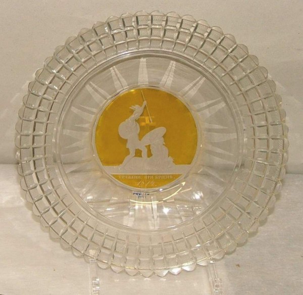 В 1838 году к 25-летию победы над Наполеоном и 10-летию заключения Адрианопольского мирного договора на Императорском стеклянном заводе по эскизам Ф. П. Толстого была исполнена серия тарелок с гравированными изображениями на темы Отечественной войны 1812 года, Заграничных походов 1813–1814 годов и русско-турецкой войны 1828–1829. Серия, посвященная Отечественной войне и Заграничным походам, состояла из девятнадцати тарелок (по количеству медалей, созданных Толстым в 1814–1830), а серия, связанная с русско-турецкой войной, — из шести тарелок. Все тарелки были созданы с применением новой в то время техники серебряной протравы, благодаря которой аллегорические гравированные изображения ясно видны на желтом фоне нацвета. Тарелки были преподнесены императору Николаю I к празднику Святого Рождества в декабре 1838 года и хранились по его распоряжению в сервизной кладовой Собственного (Аничкова) дворца. 1812 год в произведениях искусства из собрания Русского музея. СПб, 2012. С. 120.