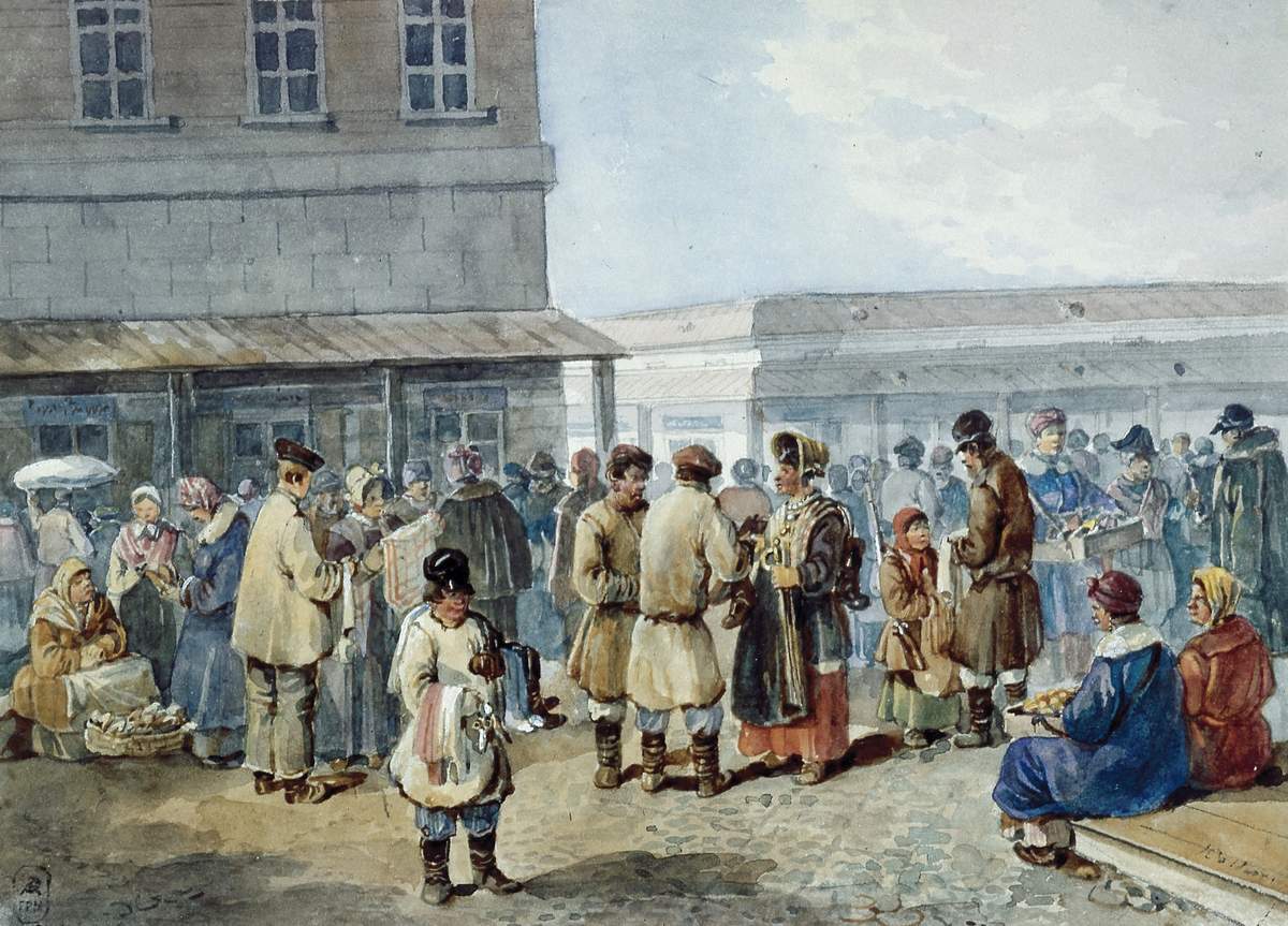 Жанровые акварели Кольмана 1820-1840-х годов были популярны и пользовались успехом у современников как в России, так и Европе. Позднее на рубеже XIX-XX веков они по-прежнему привлекали внимание коллекционеров. После первых акварельных опытов в „костюмно-типажном роде" художник начиная с 1820-х годов исполнял многофигурные жанровые композиции на фоне городских улиц и набережных Петербурга. Удачно найденный типаж (чуть неуклюжие добродушные крестьяне) и круг мотивов он вновь и вновь повторял, создав хорошо узнаваемый „кольмановский" тип жанровых изображений. В акварелях художника город жил своей обыденной, повседневной жизнью — строился и торговал, петербуржцы стремительно мчались в санях и колясках по его улицам. Все это вместе с криками уличных торговцев и извозчиков, яркостью крестьянской одежды было важным элементом в формировании городской среды, отличающейся пестротой и многоликостью. Наталия Соломатина // Санкт-Петербург: Портрет города и горожан. СПб, 2003. С. 218.