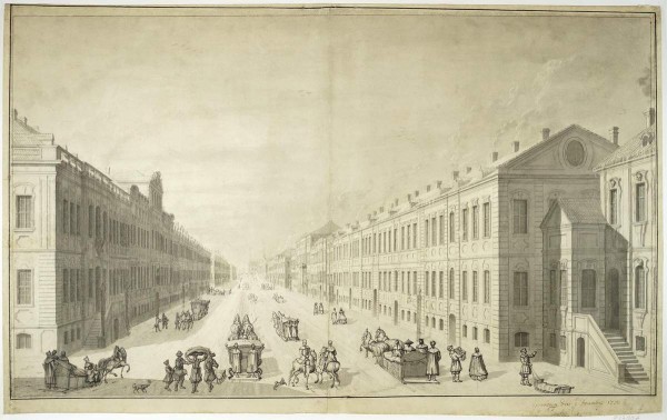 Немецкая улица (теперь Миллионная), как и сейчас, начиналась от Лебяжьей канавки и выходила к Дворцовой площади. Махаев очень удачно передал строгую перспективу улицы, обстроенной трехэтажными домами со скромным архитектурным убранством, уводящей зрителя к Зимнему дворцу. Рисунок интересен тем, что представляет собой одно из редких для того времени изображений города зимой. Ольга Левандовская // Санкт-Петербург: Портрет города и горожан. СПб, 2003. С. 24.