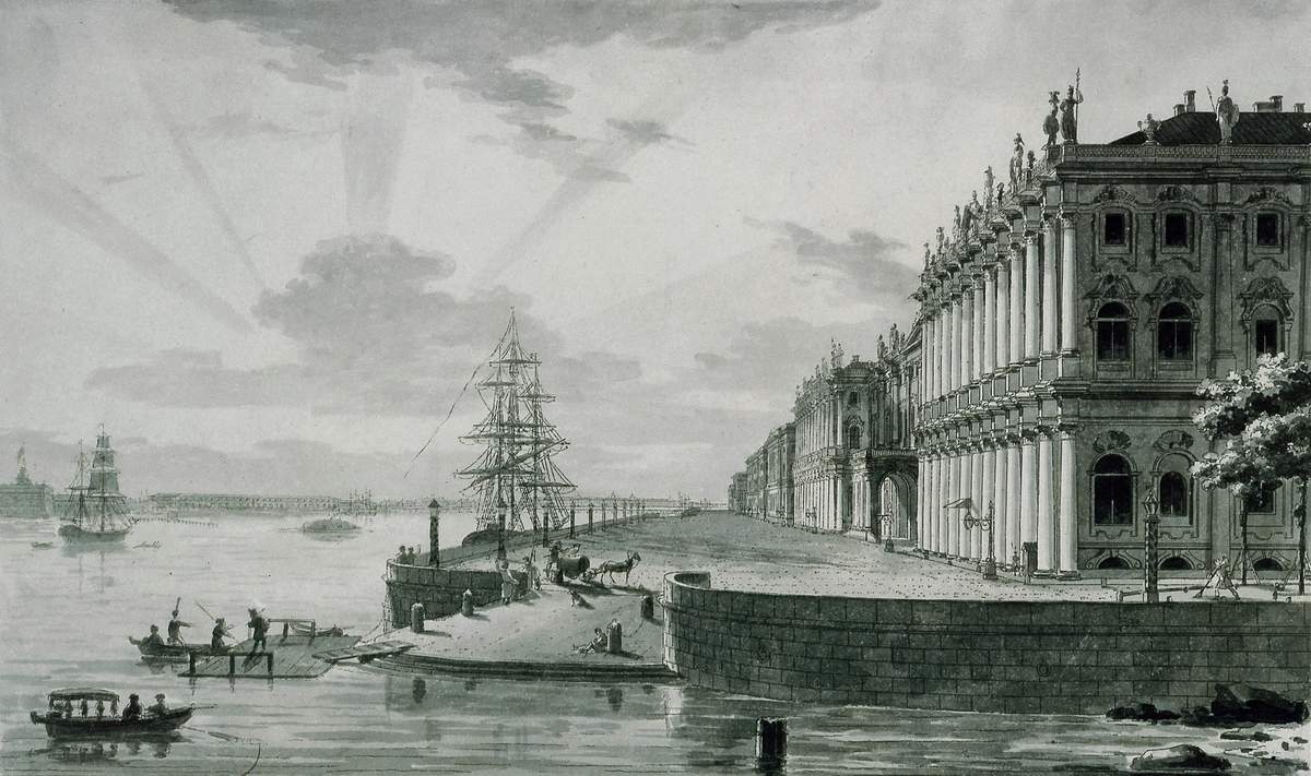 Это произведение Воробьева было весьма популярно и неоднократно повторялось и варьировалось художником. Зимний дворец, „одетая в гранит" Дворцовая набережная уже обрели привычный облик, который сохранился практически неизменным. И только отсутствие Дворцового моста (он будет возведен в 1912–1916 годах), связывающего центральную часть города и стрелку Васильевского острова, отличает этот вид пушкинского Петербурга от того, что так хорошо знаком в настоящее время. Наталия Соломатина // Санкт-Петербург: Портрет города и горожан. СПб, 2003. С. 59.