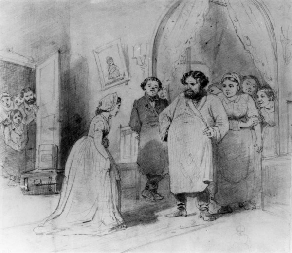А если бы мы захотели назвать наиболее типичную картину «шестидесятых», то без колебаний выбрали бы «Приезд гувернантки в купеческий дом». Небольшого размера, с четко выстроенным сюжетом, «выхваченным из гущи жизни» (любимое выражение Стасова) со всеми ее обыденными подробностями, подглядывающими, подслушивающими, – все это чрезвычайно показательно для живописи десятилетия, вместившего в себя «Прерванное обручение» А. М. Волкова и «Сватовство чиновника» Н. П. Петрова, «Поздравление молодых» Г. Г. Мясоедова и «Проводы начальника» А. Юшанова, «Торг» Н. В. Неврева и «Славильщиков-городовых» Л. И. Соломаткина. В этом «федотовском» ряду «Гувернантка» выделяется не бросающимися в глаза, но принципиальными моментами. Смысл ее не исчерпывается фабулой: рассказом о девушке, стоящей выше среды, в которую она попала и в которой обречена существовать в атмосфере унижения и «бессовестного любопытства». Сюжетный мотив истолкован композиционно как (подобно «Чаепитию») столкновение лицом к лицу добра и зла. Главных персонажей разделяет тень, из которой возникает отвратительная фигура «сынка». Бытовая сценка перерастает в картину о склонении гордости. Леняшин В. А. «Святые шестидесятые» // «Святые шестидесятые». Живопись, графика, скульптура. СПб. 2002. С. 8.