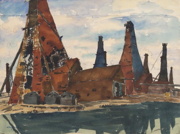 Показавшиеся издалека рощей кипарисов нефтяные вышки «имели вид узких, высоких, слегка усеченных пирамид с поперечными перекладинами, делившими их на несколько этажей. Они были обшиты доверху железными листами, выкрашенные масляной краской в разные цвета: белый, желтый, темно-коричневый, красный. У многих вышек краска на листах облезла, закоптилась или выцвела. <…> Нефтяные промыслы и все окружающее восхитило меня как художника своей страшной действительностью, мрачным грозным романтизмом и необыкновенной живописностью» (Остроумова-Лебедева, 2003. Т. I–II. С. 501–502). Юлия Солонович А. П. Остроумова-Лебедева — художник и коллекционер. СПб, 2016. С. 44.