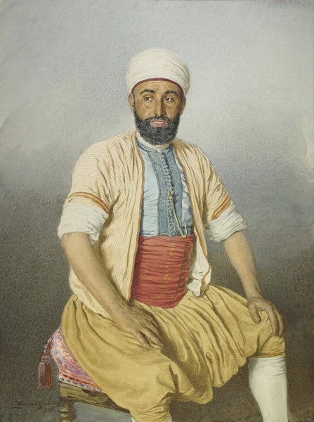 20 июля 1901 года в Петербург прибыло Первое марокканское посольство, возглавляемое министром иностранных дел страны Си Абделькримом Бенслиманом. Событие было неординарным. Напряженность в интересах европейских держав остро ощущалась в отношении территорий Северной Африки и, прежде всего, Марокко. Молодой султан Мулай Абдельазиз стремился модернизировать страну, одновременно пытаясь наладить диалог с ведущими европейскими державами. 23 июля 1901 года посольство было принято императором Николаем II в Большом Петергофском дворце. Столичная пресса писала об этом, не забывая отметить непривычный облик и национальные одежды членов посольства, вызвавшие большой интерес. «Они одеты, – передавало Российское телеграфное агентство, – в белые хитоны и разноцветные азиатские сапоги. Над хитоном у некоторых висят оригинальные шашки, а поверх хитона выступает белый плащ. На головах у всех белая чалма, которая скрывается в складках плаща». Вскоре Степан Федорович Александровский, известный акварелист рубежа XIX–XX веков, исполнил серию портретных изображений членов Марокканского посольства. Всего художником было создано 20 акварельных портретов, которые поступили на хранение в Императорский Эрмитаж. Наталия Соломатина // Африка в русском искусстве. СПб. 2023. С. 56.