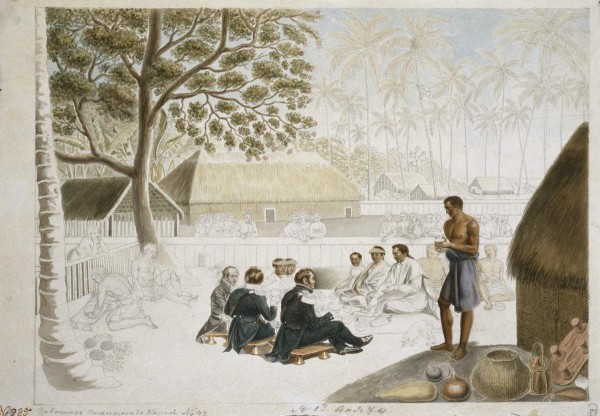 Ф. Ф. Беллинсгаузен, М. П. Лазарев и П. Н. Михайлов на завтраке у Таитского короля