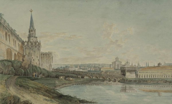 Кута́фья башня (также Предмо́стная, Отводна́я, Борисогле́бская) — единственная сохранившаяся отводная башня-стрельница Московского Кремля, составляла единый оборонительный комплекс с Троицкой башней и Троицким мостом, которые также видны на акварели Иллариона Мошкова. Кутафья башня датируется периодом между 1495—1516 годами, автором проекта считают итальянского архитектора Алевиза Фрязина. Ажурный верх добавили в XVII веке. Подробнее см. статью в Википедии.