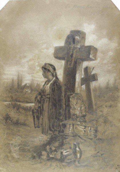 В 1865 году в Обществе поощрения художников был объявлен первый конкурс на лучшую картину жанровой живописи на русскую тему и пейзажной — на мотивы русской природы. В тот же год в вечернюю рисовальную школу ввели двух преподавателей пейзажной живописи — молодого, окончившего Академию А. А. Киселева и уже завоевавшего признание А. Г. Горавского. Все это вместе взятое могло оставить некий след и в душе Васильева, в его еще, может быть, не вполне осознанном влечении именно к пейзажу. Конечно, занятия в рисовальной школе лишь косвенно подготовляли его к самостоятельной работе над пейзажем, поскольку в учебную программу входила главным образом работа над рисунком по оригиналам, иногда только сюжетно связанным с пейзажем. Таков, например, еще очень ранний учебный рисунок Васильева «Девушка-украинка на старом кладбище» (1863). Мальцева Ф. С. Федор Александрович Васильев. Л., 1986. С. 12,15.