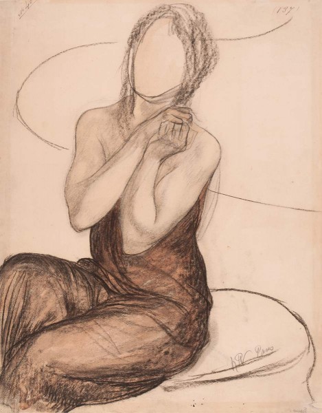 В 1908–1917 годах в графическом творчестве Петрова-Водкина преобладали этюды и эскизы, теснейшим образом связанные с картинами и монументальными росписями, созданными в это же время. Замыслы всех главных композиций (с ними он выступал на выставках Парижа, Петербурга и Москвы), составивших славу художника, сначала возникали и находили свое решение в многочисленных листах. «Берег» (1908), «Сон» (1910), «Греческое панно» (1910, местонахождение неизвестно), «Мальчики» («Играющие мальчики», 1911), «Купание красного коня» (1912), «Мать» (1913, ГТГ), «Девушки на Волге» (1915), «На линии огня» (1916) — эти названия встречаются в рисунках и набросках, принадлежащих многим музейным и частным собраниям. Они подтверждают, что в работе над композициями художник уходил от порой случайного реального впечатления и настойчиво добивался ощущения большой формы через пластическую ясность и отрицание мелочной бытовой дробности. Качество, которое когда-то Валентин Серов, любимый педагог Петрова-Водкина, назвал «парадностью», было очевидно присуще природе дарования художника, отвечало его миропониманию и корректировало задачи, поставленные им в искусстве. Замечательной выразительностью обладают рисунки к картинам «Берег» (1907–1908) и «Сон» (1910). Крупные фигуры моделей в нужных позах приобретают более жизненное, эмоциональное содержание в отличие от условно символического решения законченных холстов. Те же особенности присутствуют при сравнении других живописных произведений и их предварительных эскизов — непосредственное восприятие натуры в рисунках вступает в противоречие с окончательным, несколько отвлеченным характером образного строя живописи. Наталья Козырева. О рисунках Петрова-Водкина // Кузьма Сергеевич Петров-Водкин. СПб. 2018. С. 19.