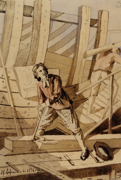 Рисунок происходит из альбома, содержащего работы художника разных лет. Судя по датировке, появление его было приурочено к 150-летней годовщине со дня смерти Петра I. Скорее всего, рисунок предназначался для журнала. Фигура царя и величественные стропила корабля масштабно соотнесены так, что смысл композиции читается однозначно: Петр I созидает Россию. И мореплаватель, и плотник. Петр Великий в русской художественной культуре. СПб, 2022. С. 90.