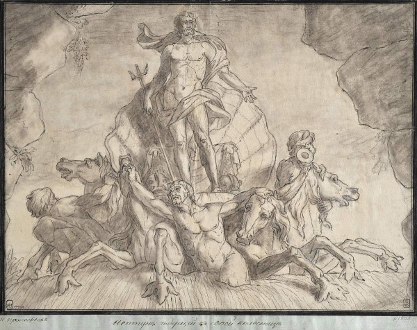 На паспарту внизу: слева — И. Прокофьевь; ниже посредине — Нептунь душій вь своей колесниць, на обороте: вверху — Группь круглый изь обозженой глины, вышиною 12 вершковь, длиною 14 вершковь дланный 1817 Года вь Октябръ мъсяць для гротта.