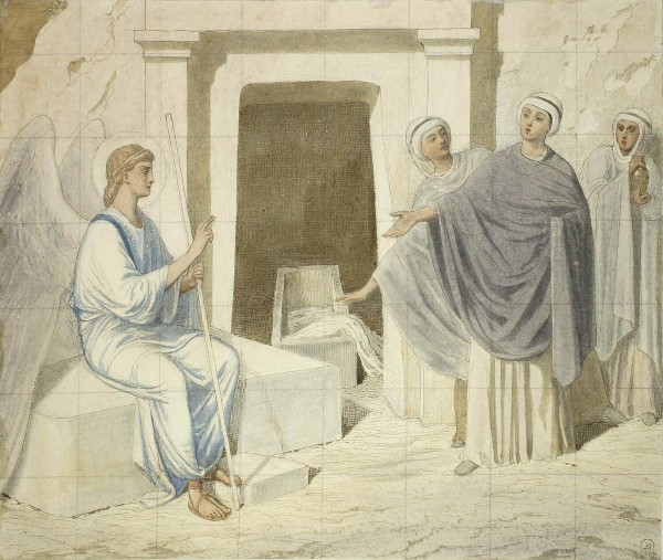 «По прошествии же субботы, на рассвете первого дня недели, пришла Мария Магдалина и другая Мария посмотреть гроб. И вот, сделалось великое землетрясение: ибо Ангел Господень, сошедший с небес, приступив отвалил камень от двери гроба и сидел на нем; / Вид его был как молния, и одежда его бела как снег. Устрашившись его, стерегущие пришли в трепет и стали как мертвые. Ангел же, обратив речь к женщинам, сказал: не бойтесь, ибо знаю, что вы ищете Иисуса распятого; Его нет здесь: Он воскрес, как сказал; подойдите, посмотрите место, где лежал Господь, / И пойдите скорее, скажите ученикам Его, что он воскрес из мертвых и предваряет вас в Галилее: там Его увидите; вот, я сказал вам». Мф. 28, 1–7; Мк. 16, 1–5; Лк. 24, 4–10; Ин. 20, 1–18. Иисус Христос. СПб, 2000. С. 327.