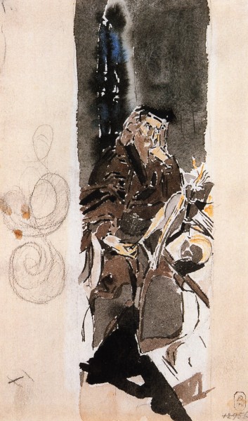 На сюжет «Фауста» И.-В. Гете. Эскиз-вариант композиции для декоративного панно (правая часть триптиха) в готическом кабинете дома А. В. Морозова в Москве (1896, ГТГ, Инв. 10989). 1896
