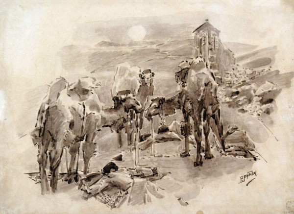 Рисунок «Караван» с его нервным ритмом и ломкими очертаниями форм связан со строфами поэмы «Демон»: «…Теснясь толпой,/ На трупы всадников порой/ Верблюды с ужасом глядели». Некогда А. А. Давыдов отметил роль среды в этом листе: «Есть нечто действительно охватывающее душу холодом в безлюдности и пустынности этого пейзажа». Исполненные тушью и белилами, рисунки отличаются от работ других авторов тем, что Врубель учел специфику книжной иллюстрации и роль листа использовал выразительные возможности черного и белого, мазков и штрихов, их ритма. / Владимир Круглов. Наследие Михаила Врубеля в Русском музее // Михаил Врубель. СПб, 2006. С. 16.