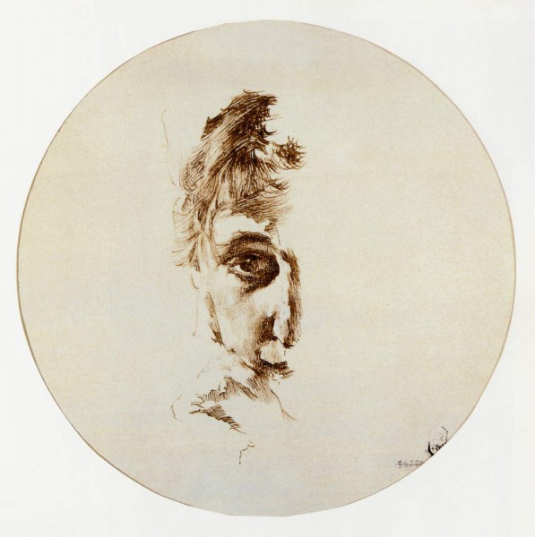 Техника <печатной графики> в конечном счете Врубеля не привлекла, но рисунки пером первой половины 1880-х годов — «Крестьянин- лирник» (1881, ГРМ, Р-13471), миниатюрные «Портрет неизвестной» (1882–1883, ГРМ, Р-2444) и «Голова собаки» (1882–1883, ГРМ), «половинный» женский портрет — говорят о твердой и уверенной руке, и случись ему продолжить опыты в офорте, он, возможно, преуспел бы на этом пути не меньше, чем Серов. / Юлия Солонович. Графика Михаила Врубеля // Михаил Врубель. К 165-летию со дня рождения. СПб, 2022. С. 20-21.
