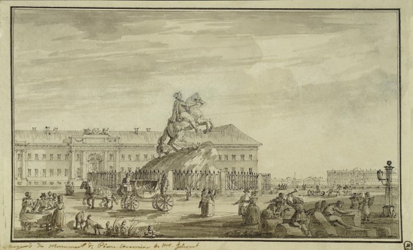 Фиксируя в своих многочисленных рисунках строящийся на его глазах Петербург, итальянский архитектор Джакомо Кваренги не мог не запечатлеть одну из важнейших достопримечательностей столицы — памятник Петру I работы Этьена Фальконе, торжественно открытый 7 (18) августа 1782 года. Памятник, созданный по желанию императрицы Екатерины II, стал не только демонстрацией идеи преемственности монаршей власти Екатерины II от самого Петра I, но и символом Петербурга, одного из главных деяний первого российского императора. И мореплаватель, и плотник. Петр Великий в русской художественной культуре. СПб, 2022. С. 148.