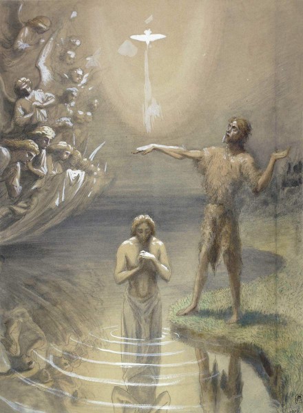 „Тогда приходит Иисус из Галилеи на Иордан к Иоанну – креститься от него. Иоанн же удерживал Его и говорил: мне надобно креститься от Тебя, и Ты ли приходишь ко мне? Но Иисус сказал ему в ответ: оставь теперь; ибо так надлежит нам исполнить всякую правду. Тогда Иоанн допускает Его. И крестившись Иисус тотчас вышел из воды, – и се, отверзлись Ему небеса, и увидел Иоанн Духа Божия, Который сходил, как голубь, и ниспускался на Него. И се, глас с небес глаголющий: Сей есть Сын Мой Возлюбленный, в Котором Мое благоволение“.