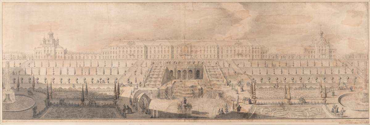 Натурный рисунок исполнен летом 1755 года. Вид завершен в мастерской в конце августа 1756 года. Послужил оригиналом для гравюры П. А. Артемьева и Н. Ф. Челнакова (Гр.-3129). Петергофский дворец изображен после перестройки, осуществленной Ф.-Б. Растрелли в 1745–1755 годах. Петербург Михаила Махаева. СПб, 2022. С. 35.