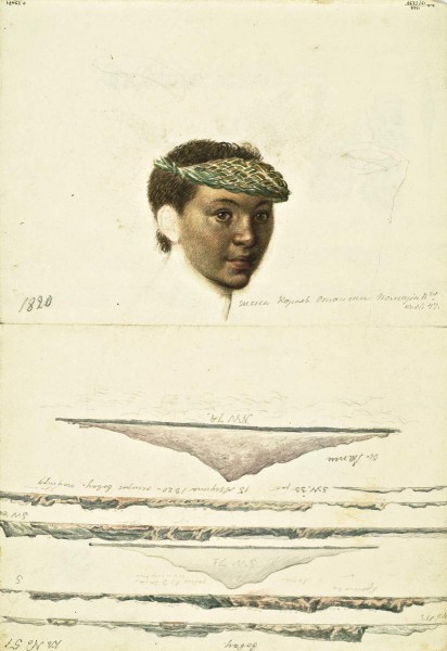На обороте: Берега кораллового острова Великого Князя Александра Николаевича. Головы туземцев Лодка. Наброски. Июль–16 августа 1820