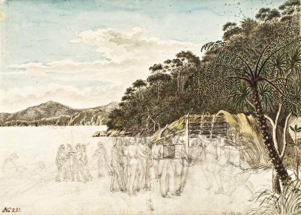 Встреча русских моряков с новозеландцами на берегу залива Королевы Шарлотты